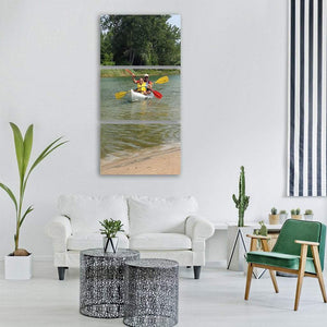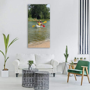 Two people paddle across a sunlit lake in this photographic canvas print, framed by a rule-of-thirds composition and a palette of green, blue, tan and yellow. The scene reads active yet serene and summery, a relaxed fit for modern rooms or sports-inspired decor.