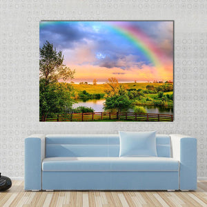 This landscape artwork features a serene Kentucky countryside scene with a vibrant rainbow over a tranquil lake, framed by rolling hills and fluffy clouds. Its picturesque vibe makes it ideal for bringing a touch of nature into your space.