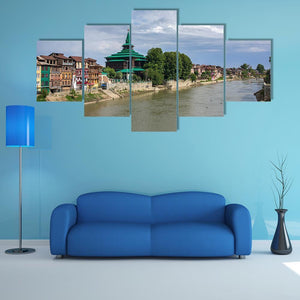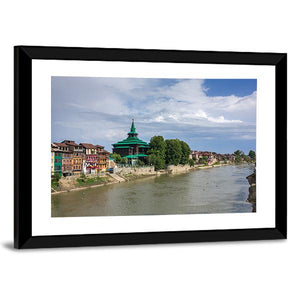Depicts the Khanqah-E-Moula mosque with a green dome beside a calm river, a row of colorful buildings, trees and a cloudy sky in a realistic, rule-of-thirds composition. The scene feels serene and picturesque — a quiet focal point for home living rooms or entryways.