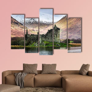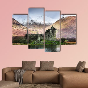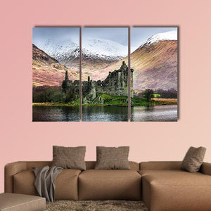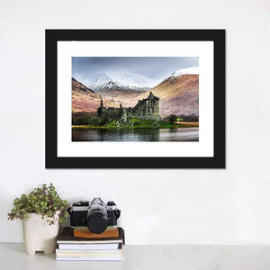 Kilchurn Castle in winter shows the ruined stone castle beside a calm lake with snow-capped mountains in the background, rendered in muted greens, greys, browns, and white. The composition feels atmospheric and serene, with a rustic, historic character that works well in rustic or historic-style interiors.