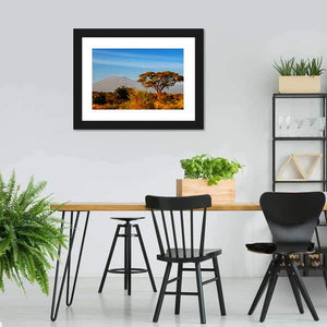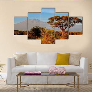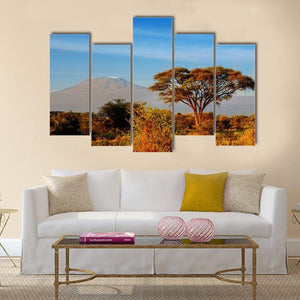 This realistic canvas shows Kilimanjaro rising above a dry savanna, with a flat-topped acacia tree and a snow-capped peak rendered in blues, greens, oranges and browns. Its serene, vast atmosphere works well in modern living rooms or nature-inspired spaces.