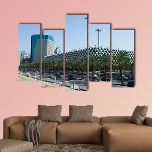 This King Fahad National Library canvas shows a wide-angle cityscape of modern architecture, palm trees, and cars, featuring the library’s distinctive diamond-patterned facade and a tall skyscraper in the background. Rendered in blues, whites, greens, and grays, the piece carries an urban daytime mood that fits modern living rooms, offices, or hallways.