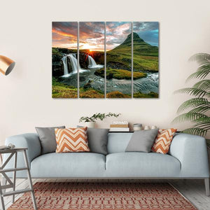 Experience the serene beauty of Kirkjufell, Iceland, with this captivating canvas artwork featuring a majestic waterfall framed by mountains at sunset. The realistic portrayal of nature's elements in shades of green, blue, and orange creates a dramatic yet tranquil atmosphere for any space.