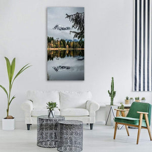 Kitzbuhler Horn Mountain Lake Canvas shows a snow-capped mountain and forest reflected in a calm lake, with pine branches in the foreground. An overcast sky and muted gray, white, green, brown, and blue tones give the photograph a serene, moody, and tranquil atmosphere. Suits modern living spaces that favor nature photography and subdued decor.