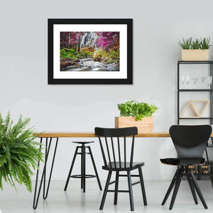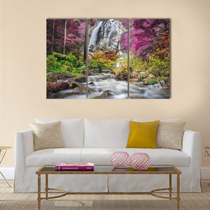 Klonglan Waterfall Thailand Canvas Wall Art shows a lush waterfall and river set among rocks, forest, and pink trees. A long-exposure treatment gives the water a silky motion while a green, pink, brown and white palette and rule-of-thirds composition create a vibrant, serene, modern-fantasy mood. Suits modern or nature-themed rooms and simple wall decor.