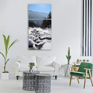 Snow-dusted forest and a mountain stream create a serene winter scene, with sunlight filtering through trees and rocks in the flowing water. Cool blues, whites, greens, and browns give the print a calm, cold atmosphere that suits nature-themed or modern interiors.