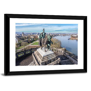 Monument in Koblenz Canvas Wall Art shows a high-angle cityscape focused on an equestrian statue at a river confluence. The daytime palette of blue, green, brown and grey gives the scene a grand, composed mood. It fits well in modern home spaces like living rooms, studies, or hallways that favor city-focused decor.