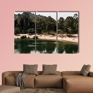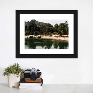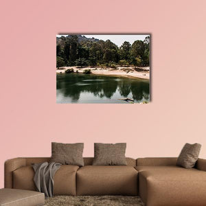 This realistic canvas depicts Konglor Cave, Thailand with a calm lake, trees and a sandy shoreline, the trees mirrored in the water. Composed using the rule of thirds, its green, brown, tan and blue palette creates a serene, natural mood that suits modern home decor such as living rooms or bedrooms.