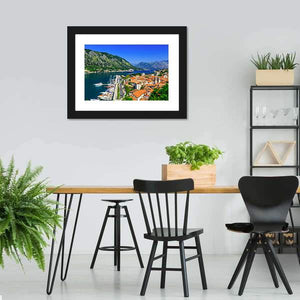 Capture the vibrant beauty of Kotor Bay with this canvas wall art. Showcasing a stunning high-angle view of the bay, town, and surrounding mountains, it brings a sunny, scenic atmosphere to your space. The artwork highlights colorful orange rooftops and features boats, making it a delightful addition to any wall decor.