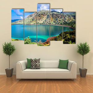 Kournas Lake Canvas Wall Art shows a serene lakeside scene with clear turquoise water, a house among trees, and textured mountains arranged using a rule-of-thirds composition. The realistic, vibrant colors create a tranquil, picturesque mood. Works well in modern or nature-inspired living rooms and bedrooms.