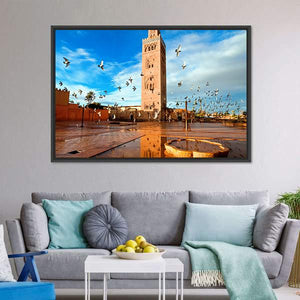 This landscape canvas features the iconic Koutoubia Mosque in Morocco, surrounded by a vibrant palette of blue, orange, and brown. The serene and historic scene captures birds in flight against a backdrop of a bright sky, creating a tranquil atmosphere.