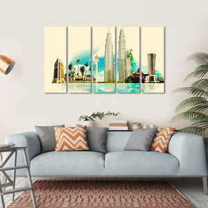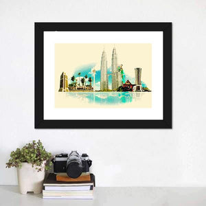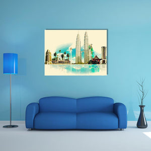 This watercolor illustration captures the vibrant cityscape of Kuala Lumpur, featuring iconic skyscrapers like the Petronas Towers, palm trees, and serene water reflections. The harmonious blue and green palette creates an urban yet tranquil atmosphere.