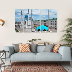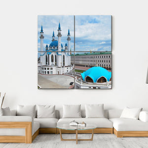 This canvas art beautifully captures the Kul Sharif Mosque, showcasing its striking white structure topped with blue domes and towering minarets. With a serene and grand atmosphere, it adds a touch of majestic architecture to any space.
