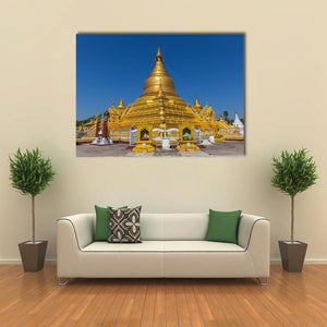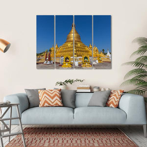 This canvas wall art beautifully depicts the Kuthodaw Pagoda, featuring a majestic golden stupa surrounded by smaller stupas under a clear blue sky. The serene and spiritual atmosphere makes it a perfect addition to your home decor.