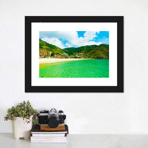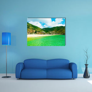 Ky Co Island Vietnam Canvas Wall Art shows a realistic beach scene with clear turquoise water, white sand, green hills and fluffy clouds, conveying a vibrant, serene tropical mood. The natural, vivid palette suits modern coastal room decor and brings a calm focal point to home interiors.