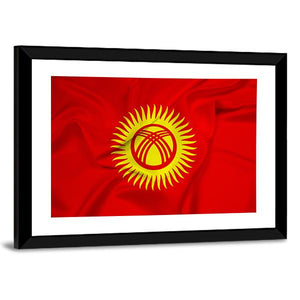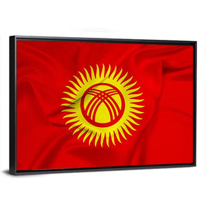 This panoramic canvas shows the Kyrgyzstan flag with a centered, graphic depiction of a yellow sun and yurt crown on a red field. The bold, patriotic artwork suits modern living rooms or a focused wall display in a study or office.