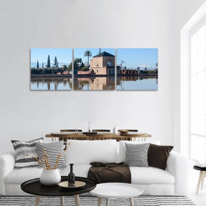 A panoramic landscape showing a pavilion-like building reflected in water with snow-capped mountains beyond, rendered in photo-realistic detail. Blue and earthy tan, brown, and green tones lend a tranquil, serene mood that fits modern interiors and contemporary room decor.