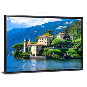 This breathtaking artwork captures a serene Italian villa by a tranquil lake, framed by majestic mountains and lush trees. The vibrant palette of blue, green, and yellow evokes a picturesque summer day, creating a sense of peace and grandeur.