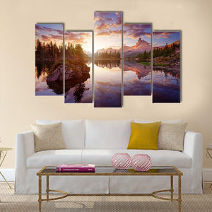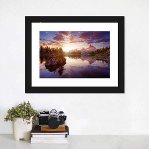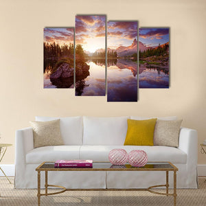 Lago Di Federa, Italy presents a photo-realistic lakeside scene with a peak mountain, trees and rocks reflected in calm water beneath dramatic clouds at sunset. Purple, orange and blue tones create a serene yet dramatic atmosphere that suits modern or nature-inspired rooms.