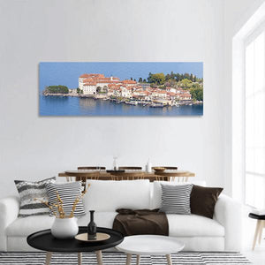 Lago Maggiore Island Panoramic Canvas Wall Art shows a serene coastal town and island with red-tiled roofs and boats docked along calm blue water. The photographic, panoramic composition and blue-white palette create a peaceful, picturesque scene that suits modern or coastal-inspired living spaces.