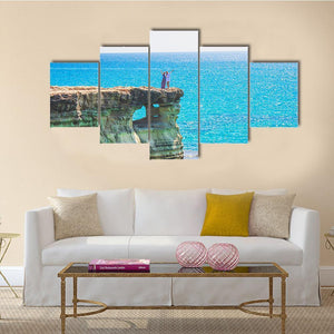 Cave Lagoon with Couple on Cliff Canvas Wall Art