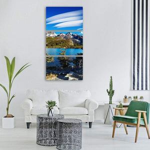 Laguna Capri presents a mountain range beside a clear blue lake, framed by evergreen trees, a rocky shoreline and wispy clouds. The photograph reads serene and majestic, a quiet nature image that suits modern or nature-themed room decor.