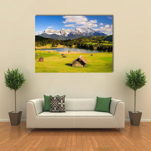 Experience the serene beauty of Bavaria with this canvas wall art featuring snow-capped mountains, a tranquil lake, and rustic wooden cabins. The peaceful landscape, portrayed in rich greens and blues beneath a clear sky, invites a sense of calm into any space.