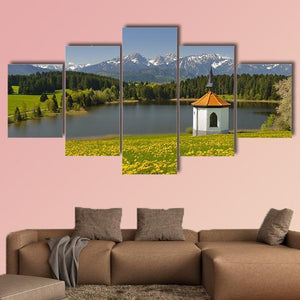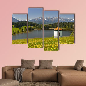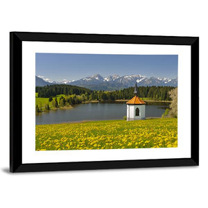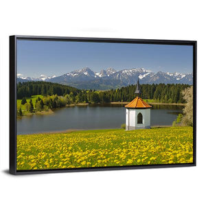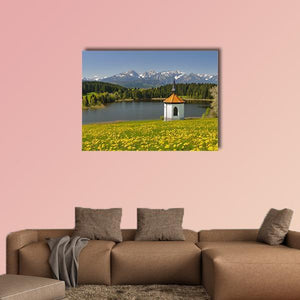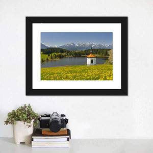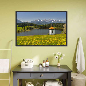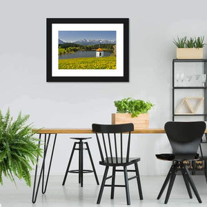A realistic landscape of a snow-capped mountain range beside a calm lake, with a field of yellow flowers and a small white building with an orange roof. The scene feels serene and idyllic, with a spring palette of blues, greens, yellows and white that suits modern or nature-inspired rooms.