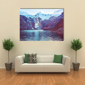 Cordillera Huayhuash, Peru, captures snow-capped peaks, a glacier, and a calm alpine lake. Rendered in cool blues, purples, whites, and brown, the modern landscape uses depth and a rule-of-thirds composition to highlight ripples on the water and rocky slopes. Suited to modern interiors, it adds a serene, majestic focal point to living rooms or entryways.