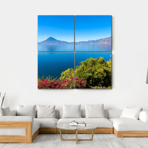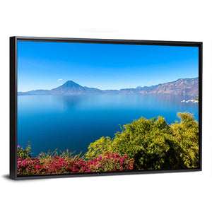 Experience the serene beauty of Lake Atitlan with this stunning canvas wall art featuring vibrant volcanoes, lush trees, and blooming flowers. The photorealistic depiction provides a peaceful atmosphere, perfect for enriching any living space.