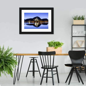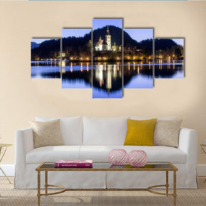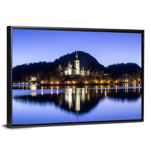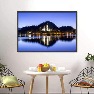 Lake Bled & Church Canvas Wall Art shows the church on its hill mirrored across calm lake waters beneath a clear night sky. This realistic photographic print leans on blues, black and soft yellows, with lights reflecting on the water to create a calm, serene atmosphere. It suits modern living rooms, bedrooms, or other quiet spaces as landscape wall decor.