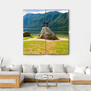 This canvas wall art captures the serene beauty of Lake Bohinj in Slovenia, featuring a majestic deer statue beside tranquil waters and towering green mountains. The realistic style and harmonious palette of greens and blues create a calming atmosphere, making it an ideal addition to any nature lover's space.