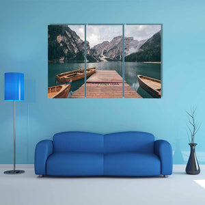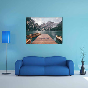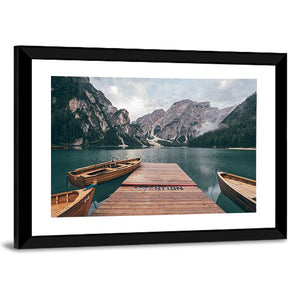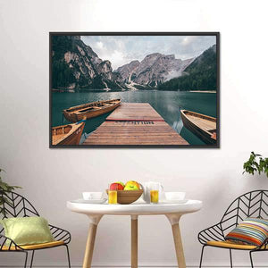 This landscape artwork features serene wooden rowboats gently resting on the tranquil waters of Lake Braies, surrounded by majestic mountains. The natural palette of blues, greens, and browns brings a peaceful vibe to any room, making it a wonderful addition to your home decor.