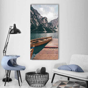 This vertical canvas captures the serene beauty of Lake Braies, featuring a calm lake surrounded by rocky mountains and a charming wooden dock. The tranquil palette of blue, green, and brown evokes a picturesque atmosphere, making it a peaceful addition to any nature-inspired décor.