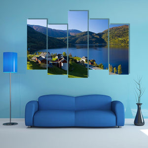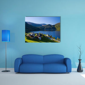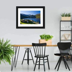 Lake Granvin Vatne in Norway depicts a tranquil lakeside village nestled among mountains and a tree-lined valley. The realistic scene of blue water, green hills and red-roofed houses feels peaceful and calm. It works well in modern or nature-inspired rooms such as living areas and home offices.