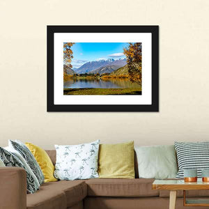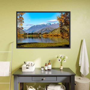 Lake Hayes In Autumn shows a wide lakeside view with snow-capped mountains, colorful autumn leaves, and a calm reflected surface. The realistic, scenic print creates a serene, natural mood and fits well in modern or nature-inspired living spaces.