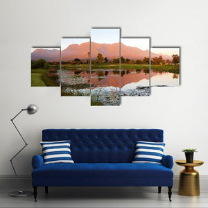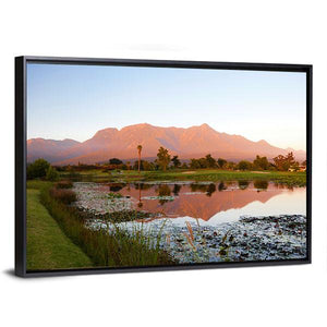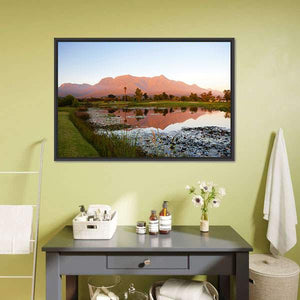 This canvas art beautifully captures a serene landscape of Lake George in South Africa, featuring tranquil mountains and lush palm trees. The warm sunset lighting reflects softly on the calm water, making it an inviting piece for nature lovers.