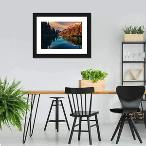 This landscape artwork features majestic mountains and a serene lake surrounded by pine trees under a tranquil sky. The reflection in the water captures the beauty of nature, making it a perfect addition to any room decor.