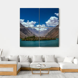 This canvas art captures the serene beauty of a lake surrounded by majestic mountains in Karakoram, Pakistan. The scene features vibrant turquoise water, snow-capped peaks, and fluffy white clouds, creating a vast, peaceful atmosphere ideal for nature lovers.