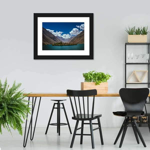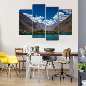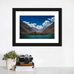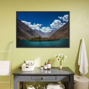 This landscape art features a serene lake surrounded by majestic mountains, an island with lush trees, and a clear sky. The calming palette of blues, greens, and browns creates a natural vibe, making it a great addition to your home décor.