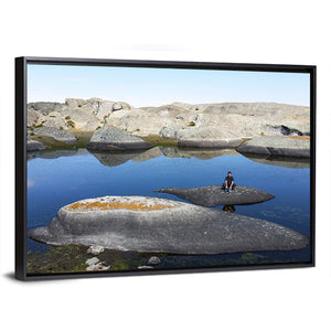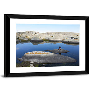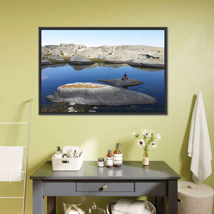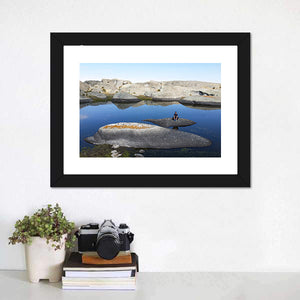 Lake in Marcahuasi shows rock formations beside calm water, with a person sitting on a rock that grounds the scene. The triptych layout and blue, grey, tan and white palette create a serene, natural mood that fits modern or rustic rooms.