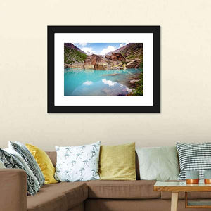 This canvas art features a serene mountain lake scene, where majestic mountains rise above tranquil waters. With reflections shimmering on the surface and vibrant yellow flowers adding a touch of color, it's a captivating piece that enhances any space.