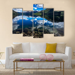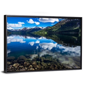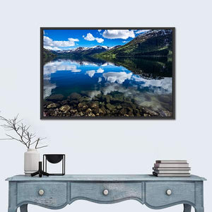 Reflection Lake, Norway shows a serene lakeside scene with snow-capped mountains mirrored in clear water. The photorealistic print highlights dramatic cloud formations and visible rocks below the surface, creating a peaceful, majestic mood that suits modern homes and nature-focused room decor.