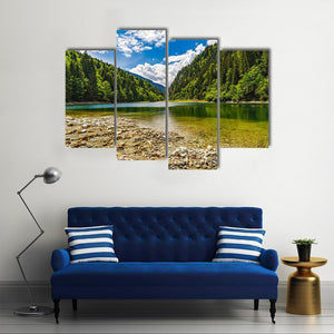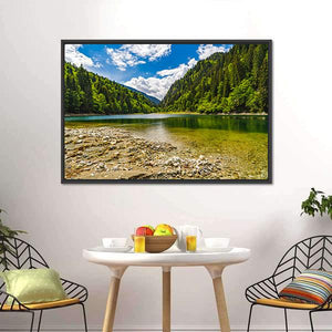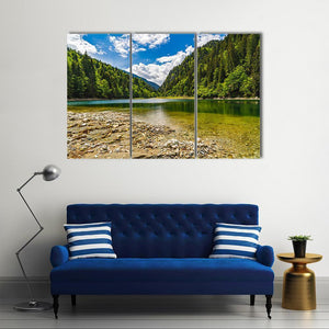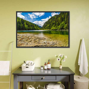A realistic canvas print of a lake in the Parang Mountains, Romania, with clear water, a pebble-strewn shore and a dense evergreen forest beneath puffy white clouds. The rule-of-thirds composition and layered depth create a calm, natural scene in greens, blues and soft browns. Suited to living rooms, bedrooms, or other nature-focused rooms.