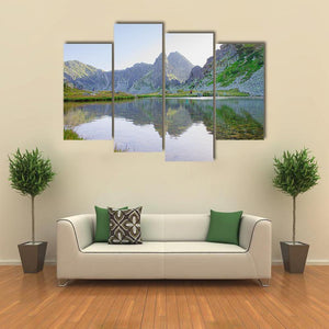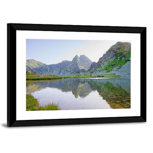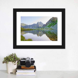 Lake In Retezat Mountains Canvas portrays a realistic mountain lake scene with jagged peaks, a grassy shore, and a clear water reflection. Rendered in blues, greens, grays, and browns with a rule-of-thirds composition, the print feels serene, tranquil, and quietly majestic. Its calm, natural palette suits modern or nature-inspired interiors and works as a subtle focal point in the home.