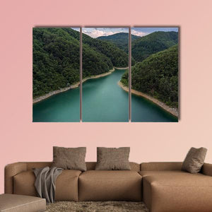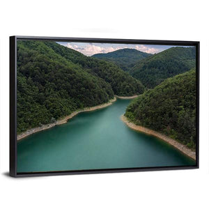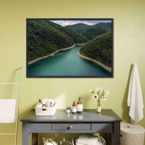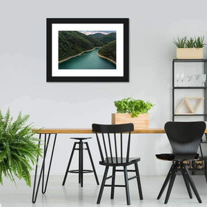 Aerial, photorealistic view of a lake and curving river threading through forested mountains. Lush green hillsides and calm teal water create a serene, natural mood that fits modern, nature-inspired rooms.