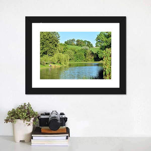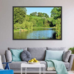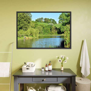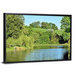 Lake In The Park Canvas Wall Art presents a peaceful, realistic lakeside scene with willow trees and people sitting on the bank. Rendered in greens, blues and browns with a rule-of-thirds composition, the print offers a serene, natural mood that suits home decor.