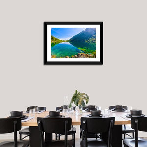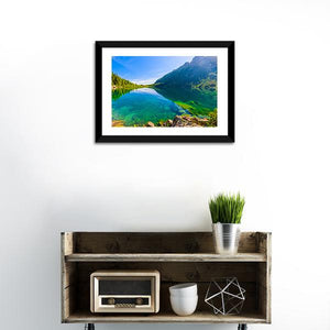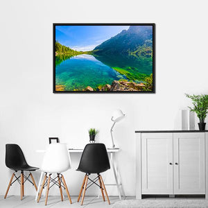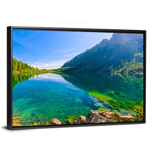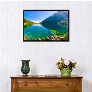 This canvas depicts a mountain lake edged by trees and rocky shores, with clear water reflecting the surrounding peaks. The blue-green palette and calm reflection create a serene, natural mood, suitable for modern living rooms or bedrooms.