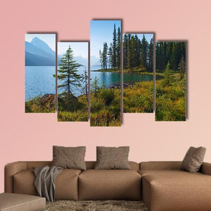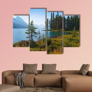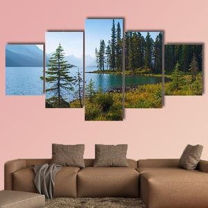 Morning On Beautiful Lake shows a serene lakeside landscape with tall pine trees, a rocky shoreline and distant mountains under a clear blue sky. The natural palette of blues, greens, browns and whites creates a calm, tranquil atmosphere that suits rustic or nature‑inspired rooms and simple modern spaces.