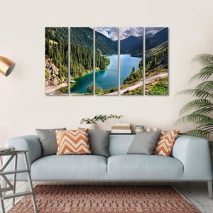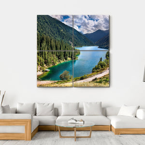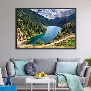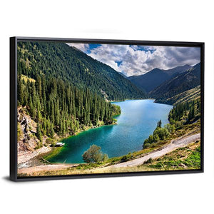 Bring the serene beauty of Kazakhstan's Lake Kolsai into your space with this stunning canvas wall art. Featuring a realistic portrayal of a mountain lake surrounded by dense green trees and rolling hills, it creates a natural and vast atmosphere perfect for any room.